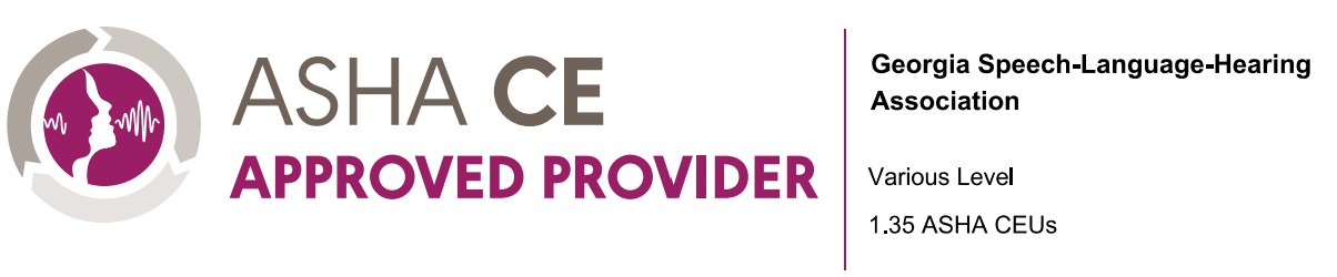 This course is offered for 1.35 ASHA CEUs. To earn ASHA CEUs for this course, attendees must complete a self-assessment of learning at the end of the event. The self-assessment is due by Saturday April 3, 2026. After review by the Georgia Speech Language Hearing Association, learner records are transmitted to ASHA for processing. ASHA posts ASHA CEUs to an individual’s ASHA CE Transcript. Please allow 6-8 weeks for the processing of ASHA CEUs.